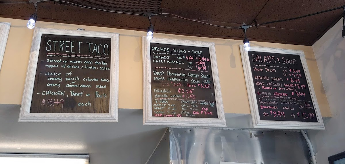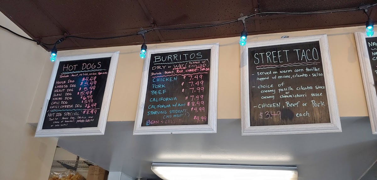 The menu at Lisa's V's features a range of fast food options primarily centered around burritos, hot dogs, and street-style tacos. Visitors can expect offerings that include various types of burritos, different styles of hot dogs such as chili and slaw dogs, and a selection of street tacos. Additionally, soups and classic sides like potato salad are available, providing a variety of choices for quick meals.